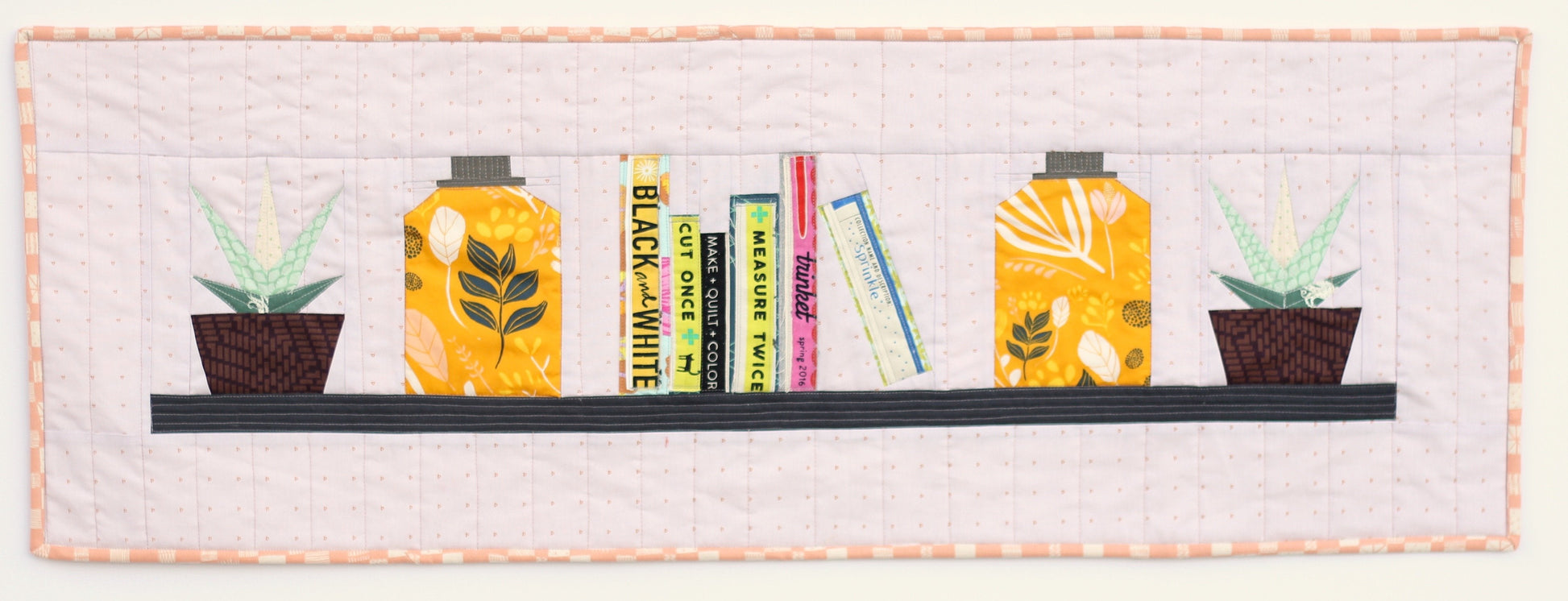 The Around the Kitchen quilt pattern features our adorable paper pieced jar, plant and book blocks on shelves! Includes instructions, illustrations, and diagrams to make the full wall quilt or an adorable table runner.