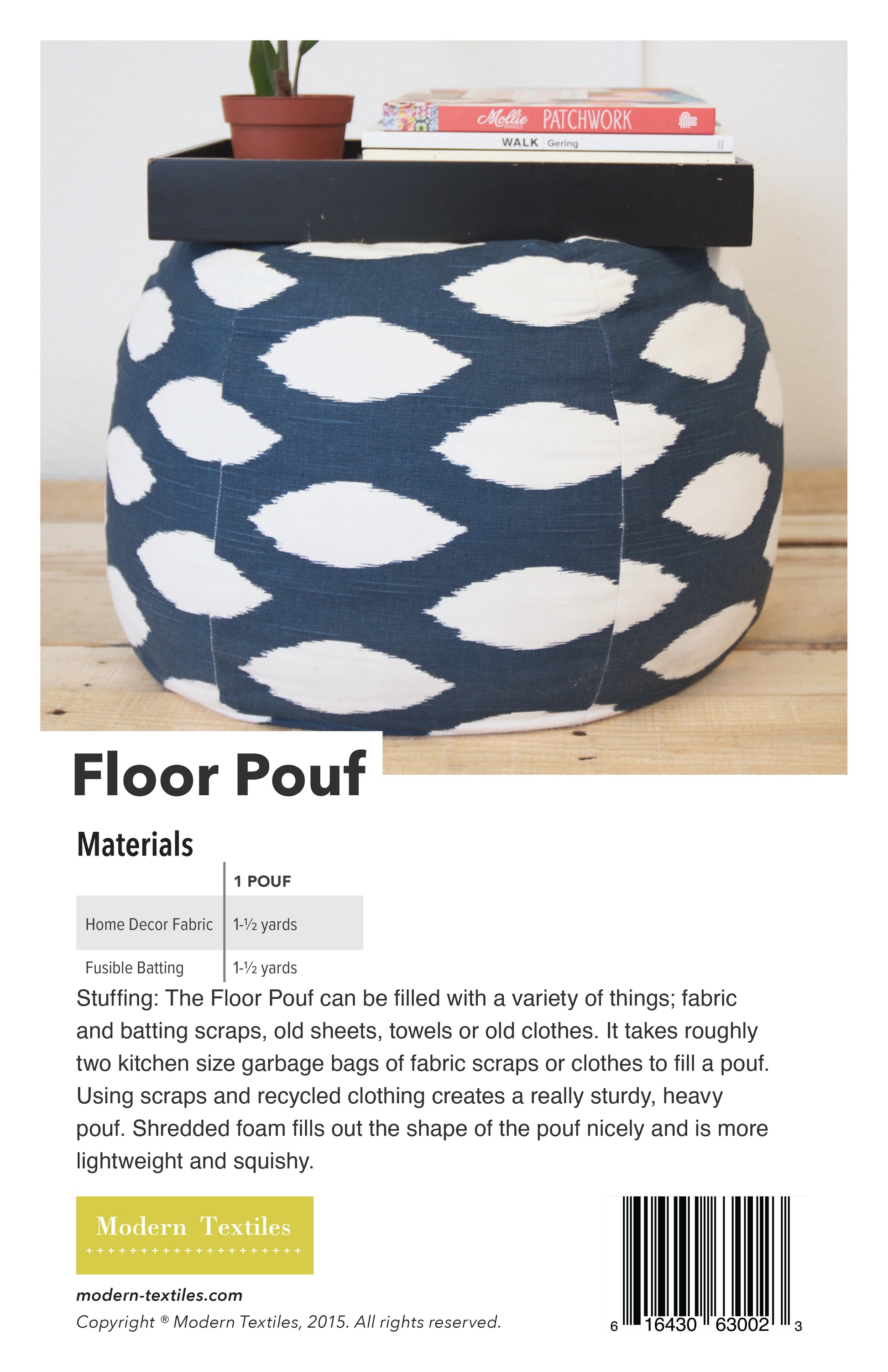 We love the versatility of the floor pouf and we know you will too! It's extra seating, an ottoman, and a coffee table all in one. And it's a fun way to add a pop of color and print to any room. Our version, like all the Modern Textiles' patterns, comes from trial and error and lots of math! Which leaves you with the fun part of picking out the fabric and sewing it up!