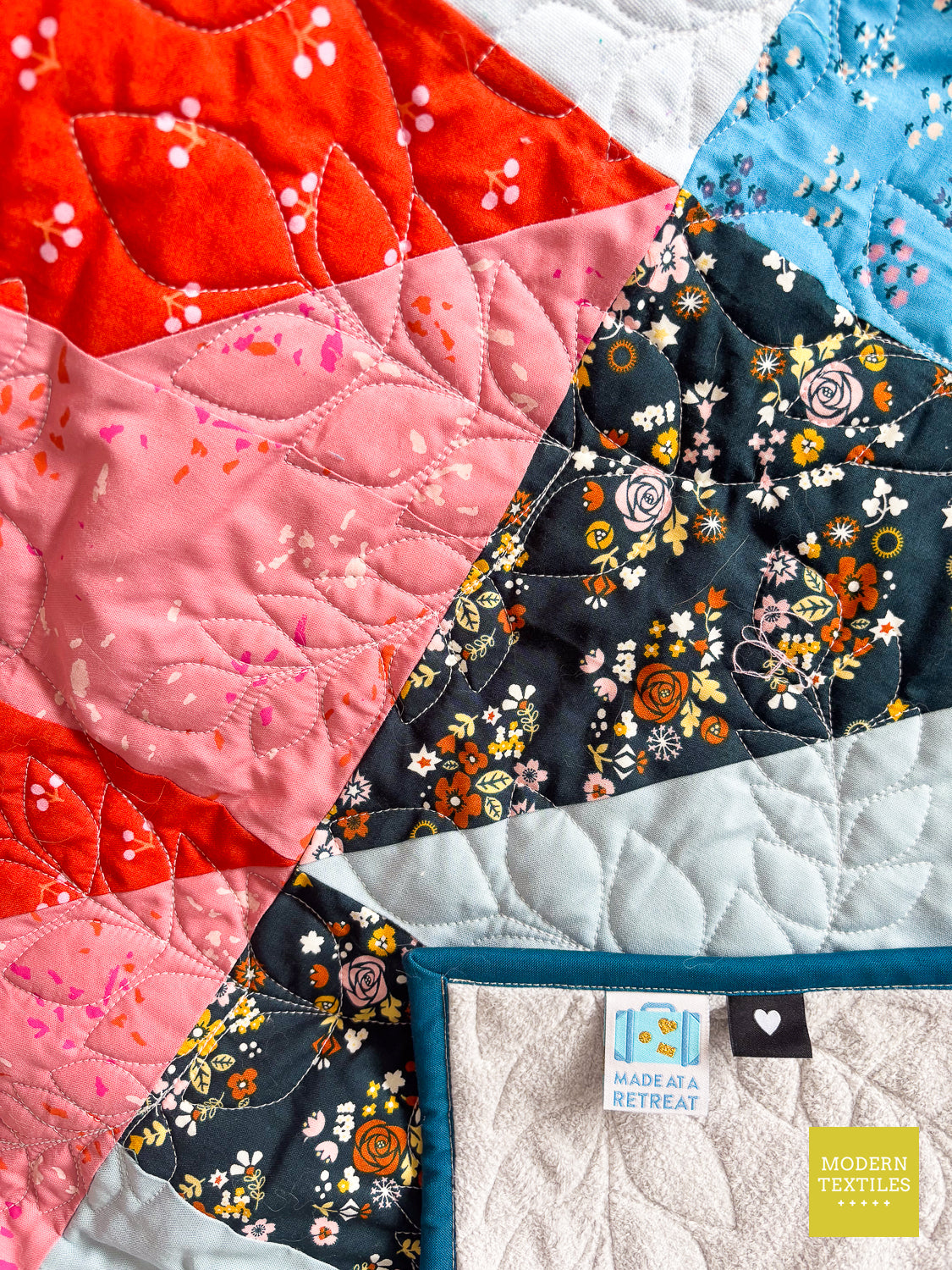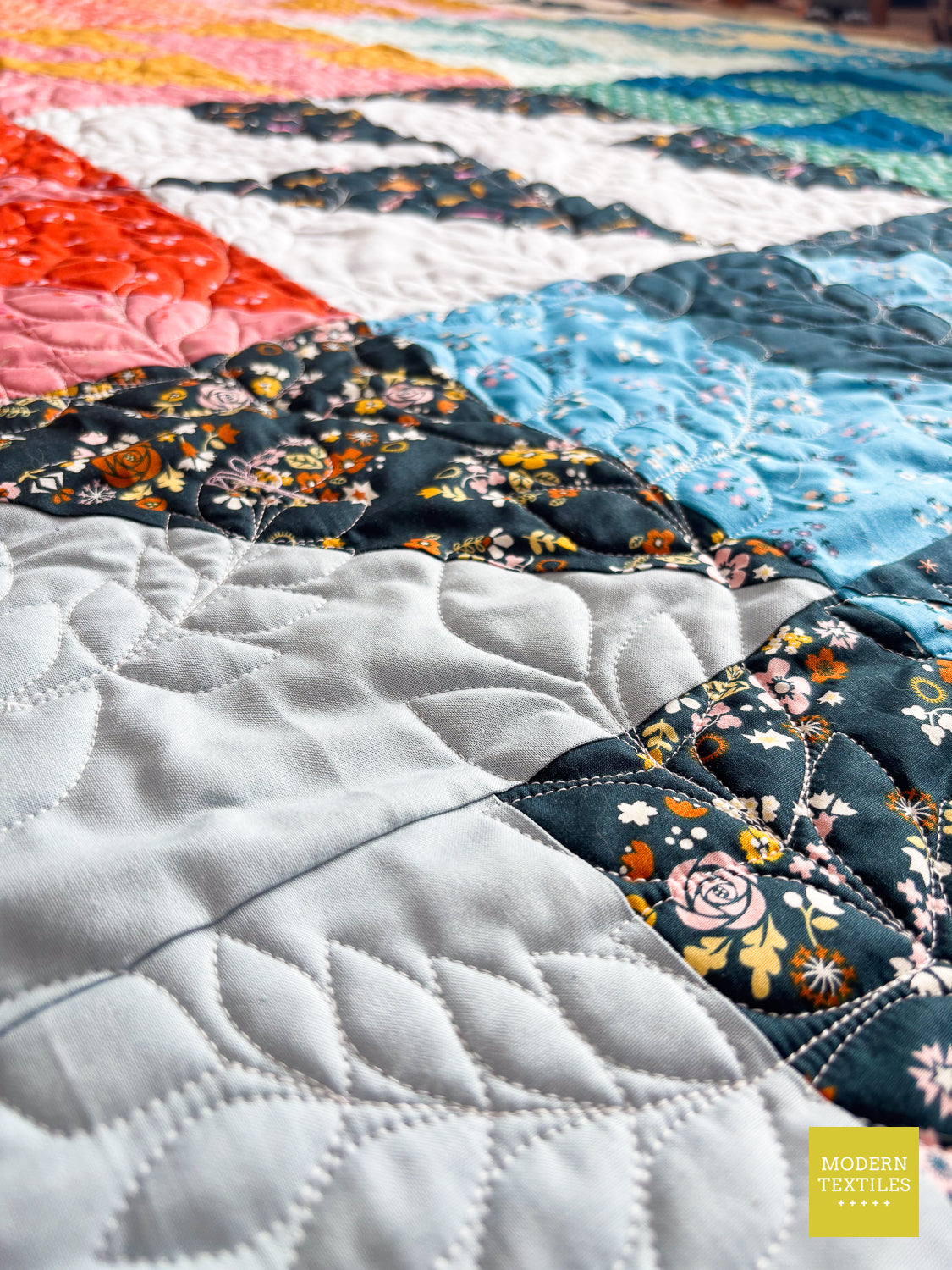 The Rockwood Quilt is a joyful celebration of spring, stitched in a soft gradient of floral fat quarters and finished with the flowing, organic texture of the Climbing Vines pantograph. This modern quilt blends playful color with gentle movement, creating a cozy, nature-inspired piece that feels fresh and full of life. A bold blue-green binding adds a modern pop, while the pale grey Fireside backing makes it irresistibly snuggly and practical for everyday use. Whether you hang it, gift it, or curl up beneath it, the Rockwood Quilt brings beauty and comfort in equal measure. Handmade with care and made to last. (Made & quilted in Alexandria, Minnesota.)