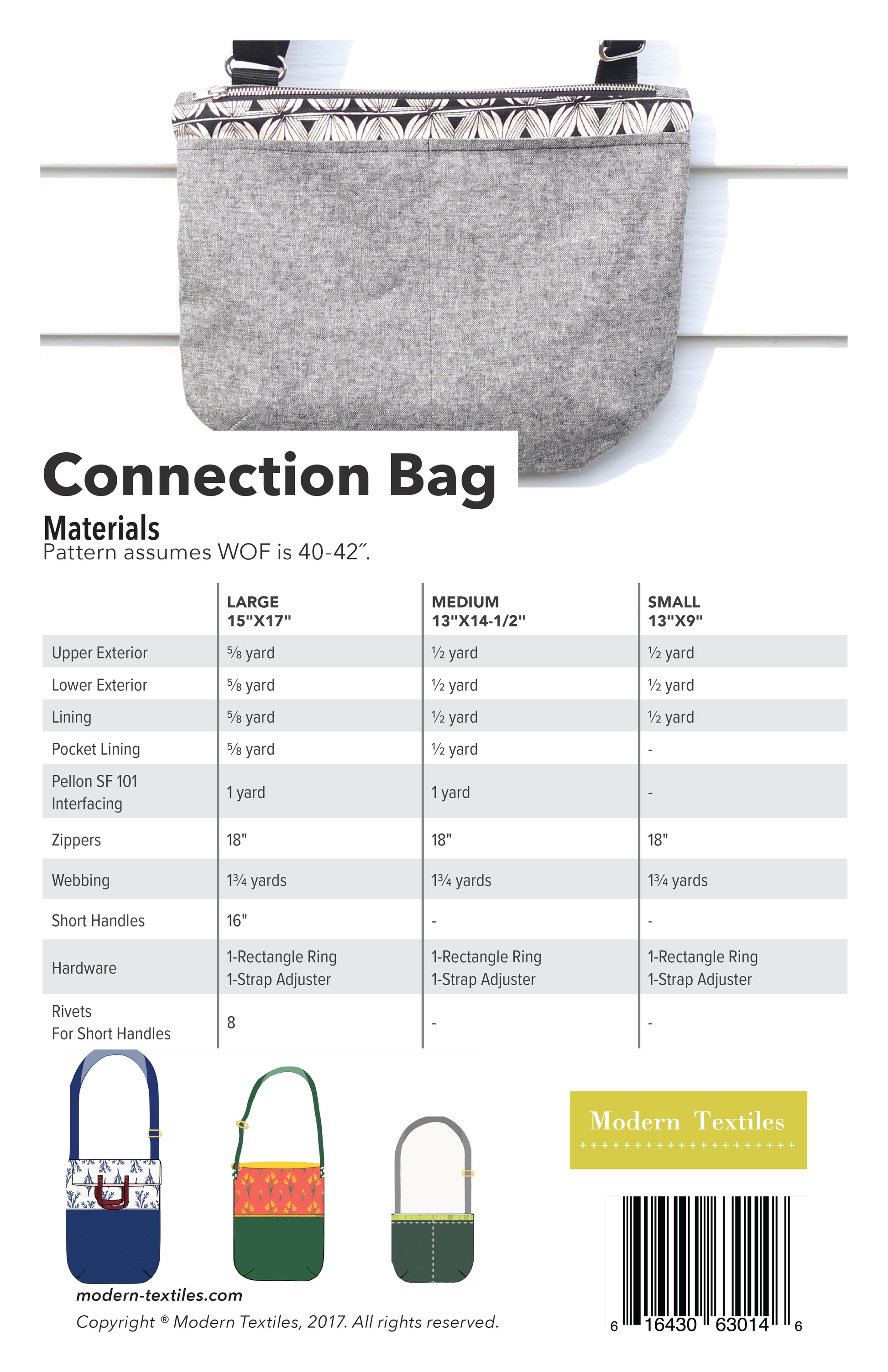 This pattern is for individual use only. Not for resale. All rights reserved. This pattern may not be copied, emailed, posted online, or otherwise reproduced or distributed. You may sell items made using this pattern based on home production scale but you must give pattern credit to Modern Textiles when listing or selling the final product.