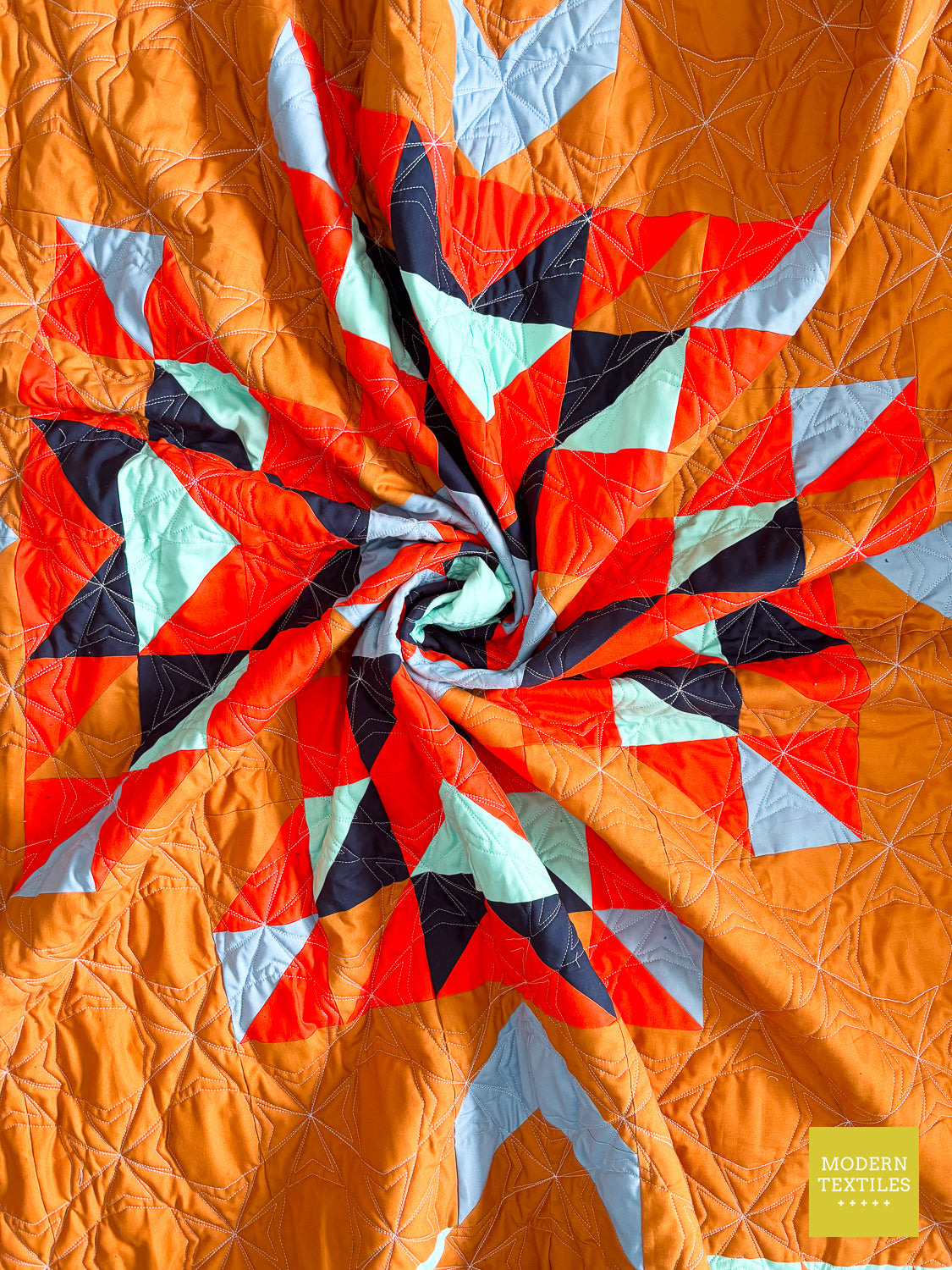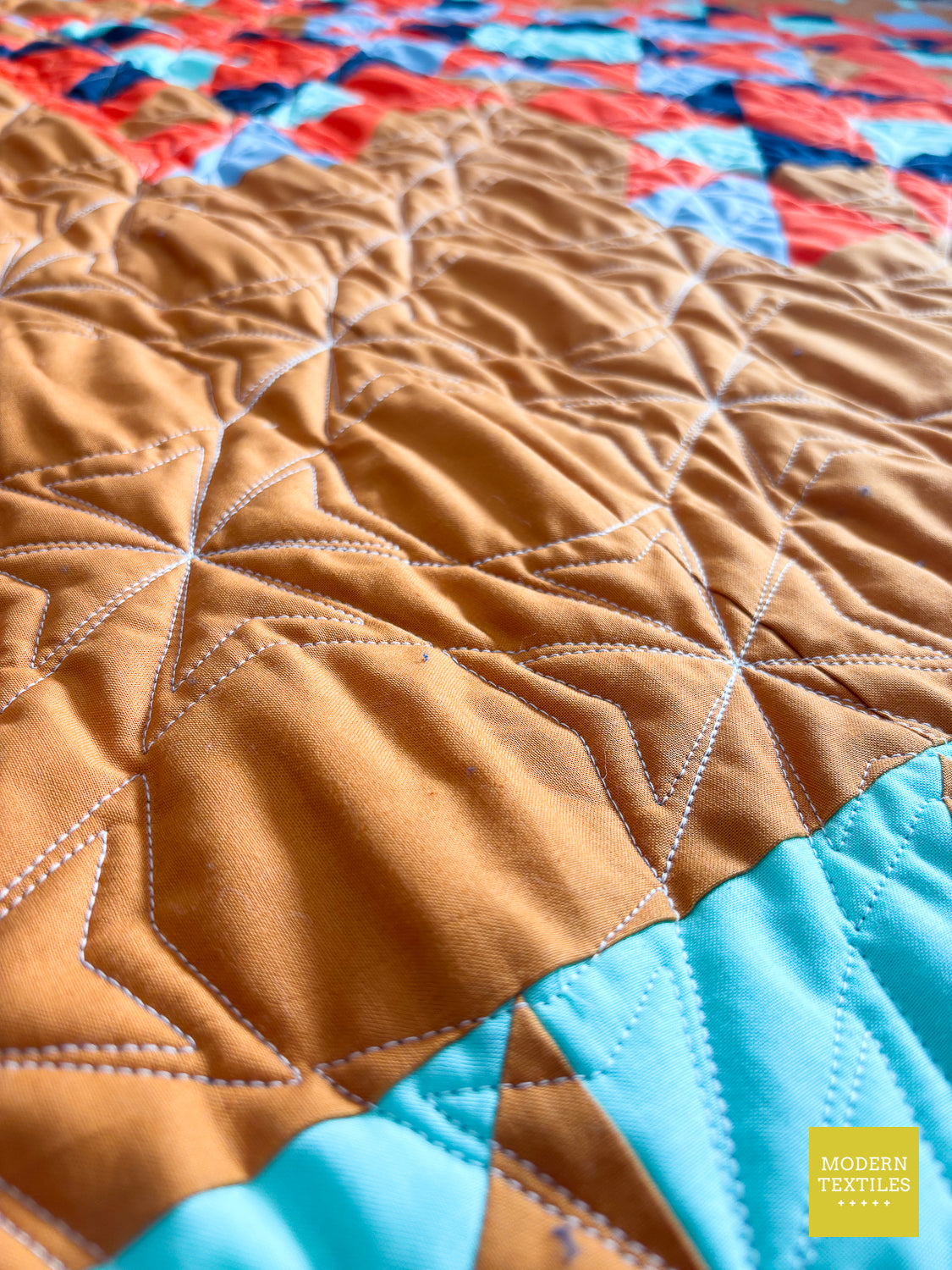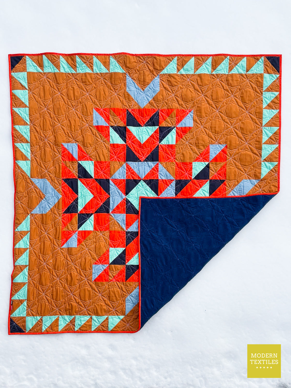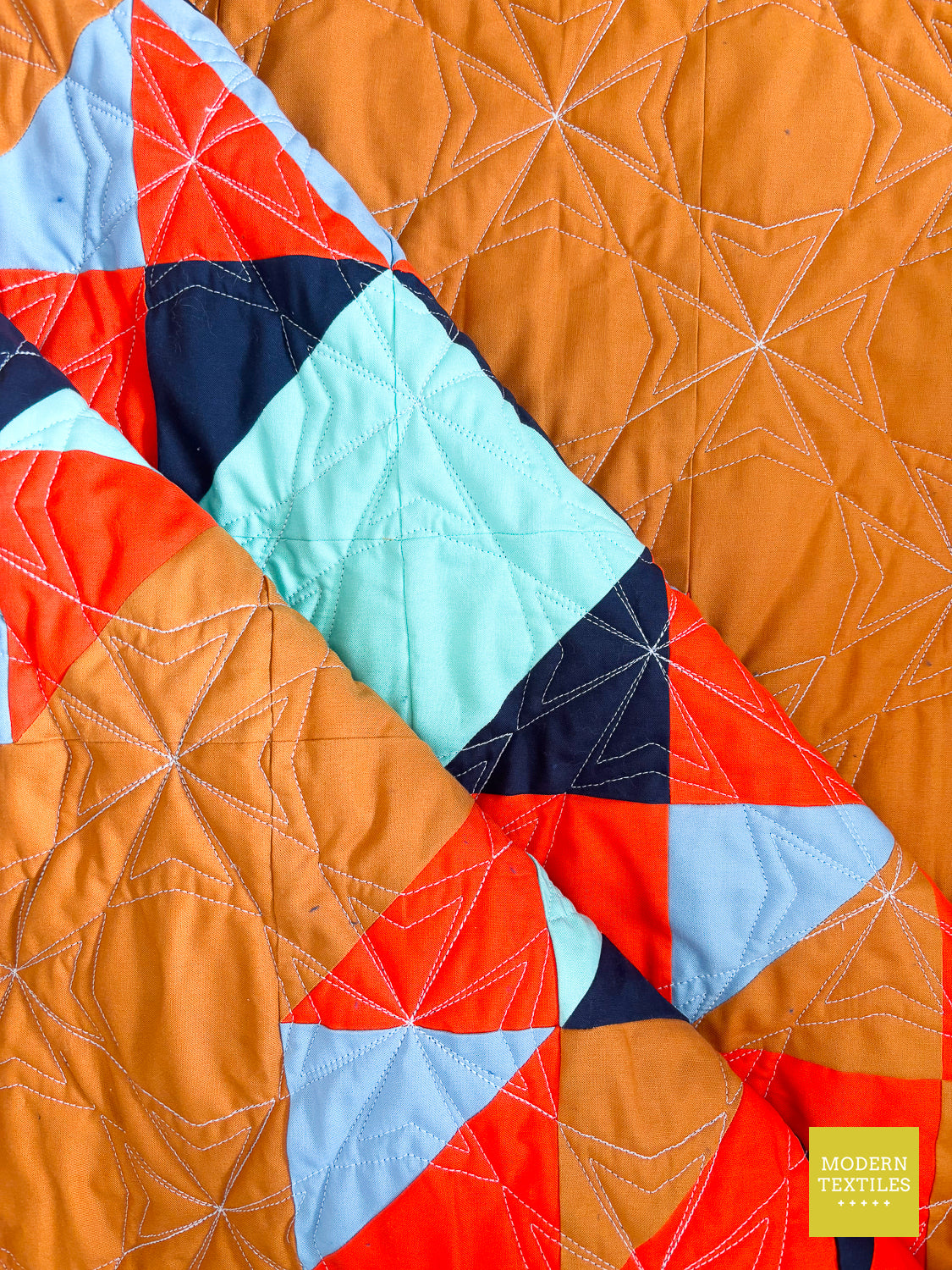 The Topaz Quilt is a vibrant, southwest-inspired modern quilt that makes a statement in any space. Quilted with the striking Octopeel pantograph, it features bold geometric texture that adds movement and depth without overwhelming the design. The warm amber background and accents of navy, seaglass, mango, and glacier create a color palette that’s both grounded and full of life. Finished with a rich navy Fireside backing and a bright mango binding for that perfect pop, this quilt is equal parts cozy, durable, and visually stunning. Whether displayed on a wall or layered on your favorite chair, the Topaz Quilt brings bold beauty to your everyday. (Made & quilted in Alexandria, Minnesota.)