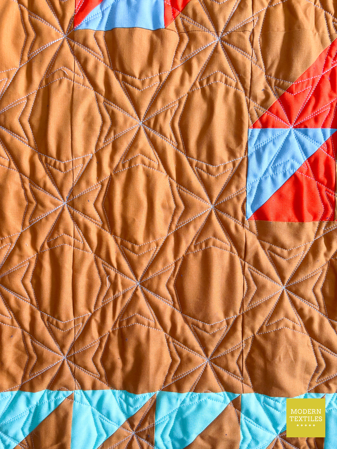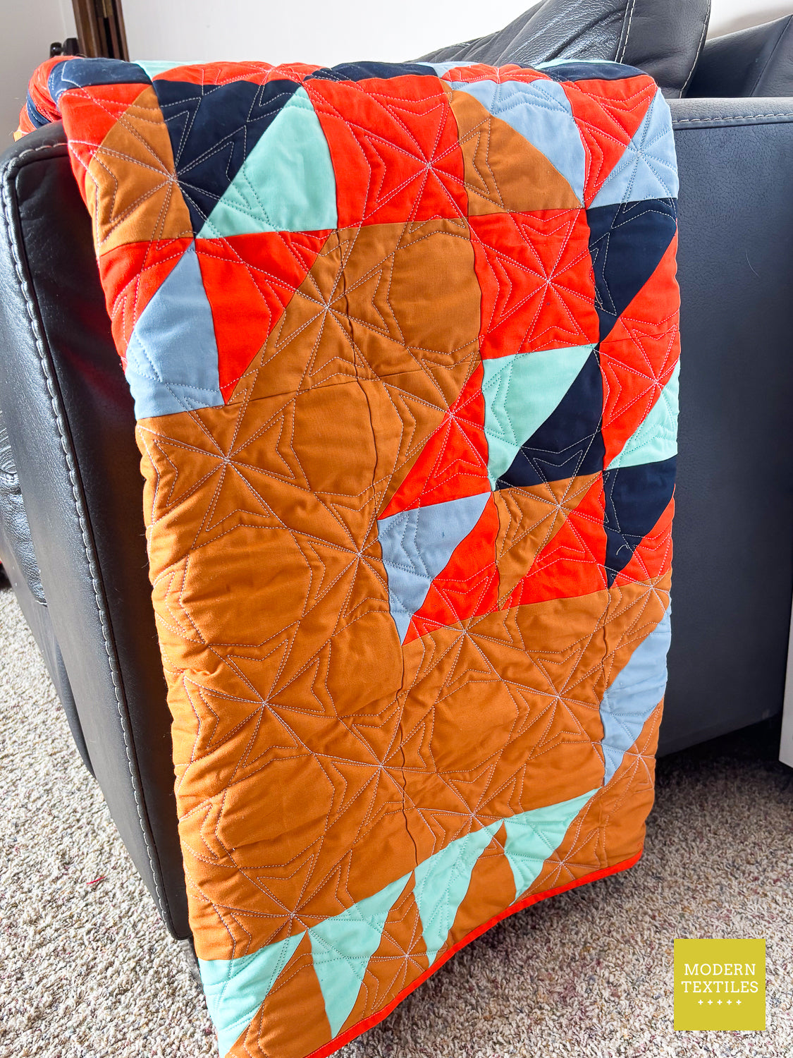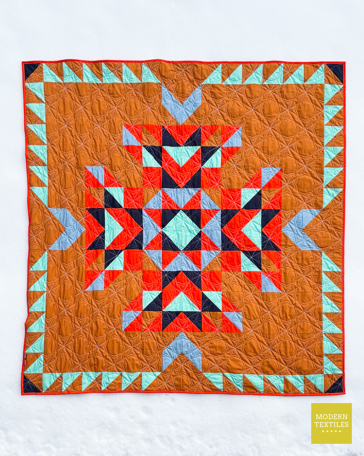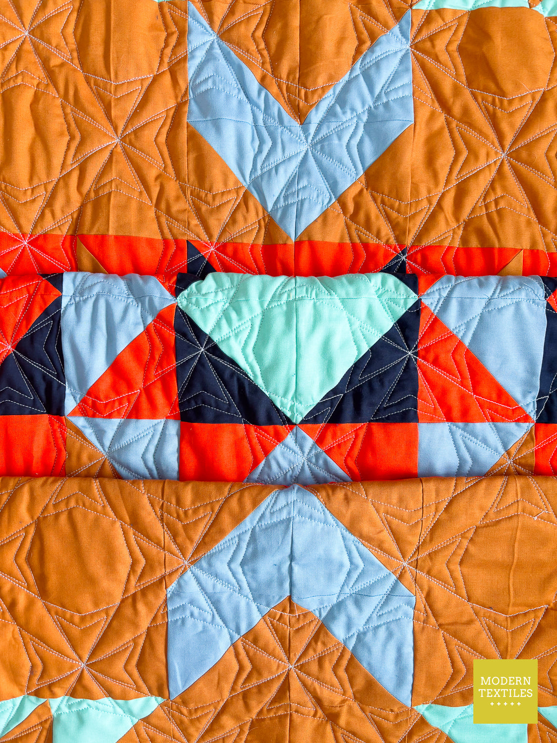 The Topaz Quilt is a vibrant, southwest-inspired modern quilt that makes a statement in any space. Quilted with the striking Octopeel pantograph, it features bold geometric texture that adds movement and depth without overwhelming the design. The warm amber background and accents of navy, seaglass, mango, and glacier create a color palette that’s both grounded and full of life. Finished with a rich navy Fireside backing and a bright mango binding for that perfect pop, this quilt is equal parts cozy, durable, and visually stunning. Whether displayed on a wall or layered on your favorite chair, the Topaz Quilt brings bold beauty to your everyday. (Made & quilted in Alexandria, Minnesota.)