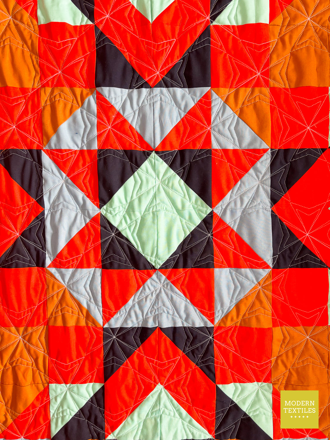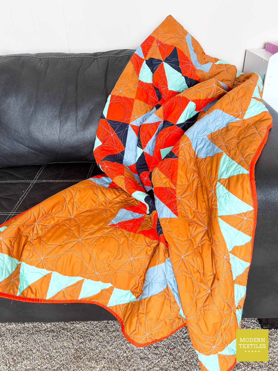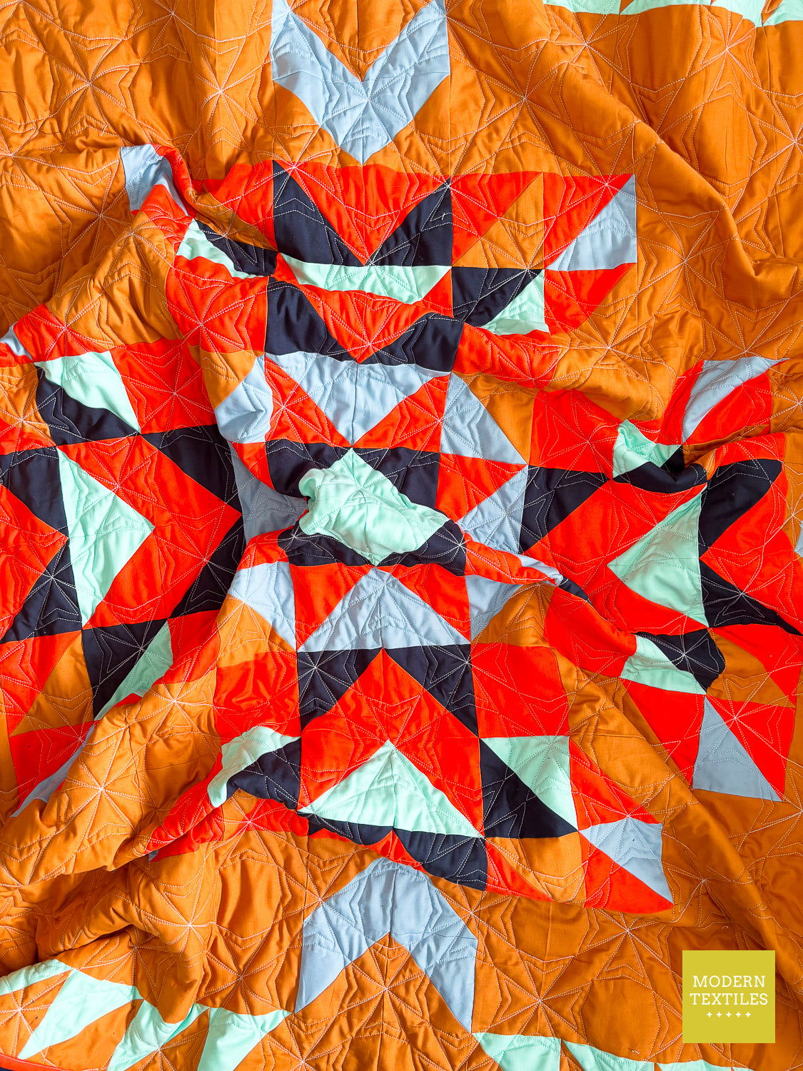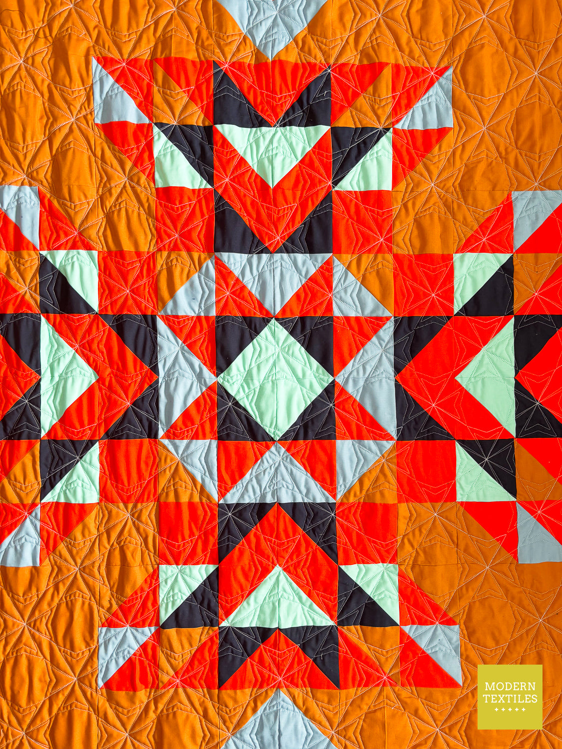 The Topaz Quilt is a vibrant, southwest-inspired modern quilt that makes a statement in any space. Quilted with the striking Octopeel pantograph, it features bold geometric texture that adds movement and depth without overwhelming the design. The warm amber background and accents of navy, seaglass, mango, and glacier create a color palette that’s both grounded and full of life. Finished with a rich navy Fireside backing and a bright mango binding for that perfect pop, this quilt is equal parts cozy, durable, and visually stunning. Whether displayed on a wall or layered on your favorite chair, the Topaz Quilt brings bold beauty to your everyday. (Made & quilted in Alexandria, Minnesota.)
