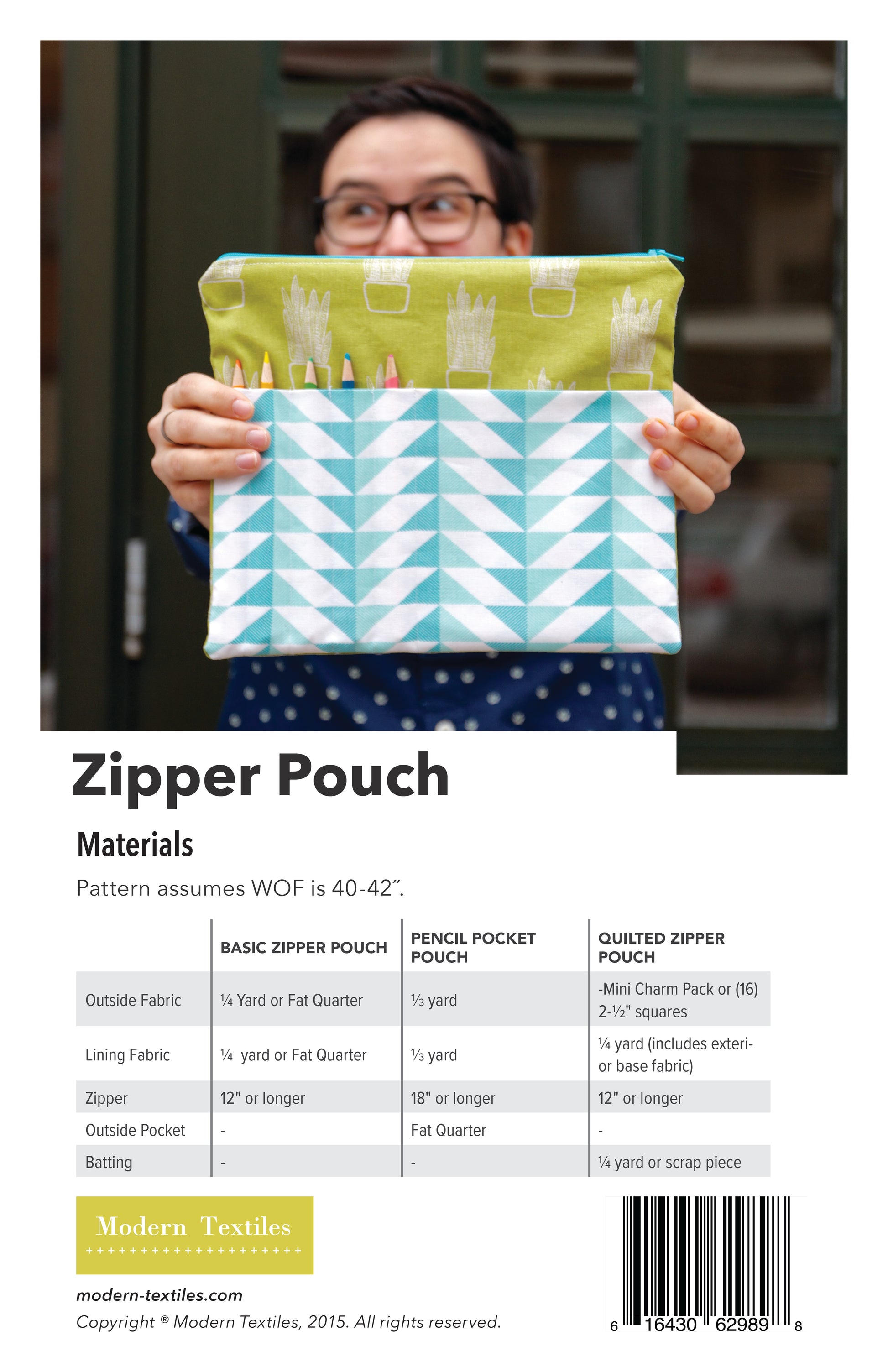 This pattern is for individual use only. Not for resale. All rights reserved. This pattern may not be copied, emailed, posted online, or otherwise reproduced or distributed. You may sell items made using this pattern based on home production scale but you must give pattern credit to Modern Textiles when listing or selling the final product.